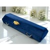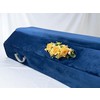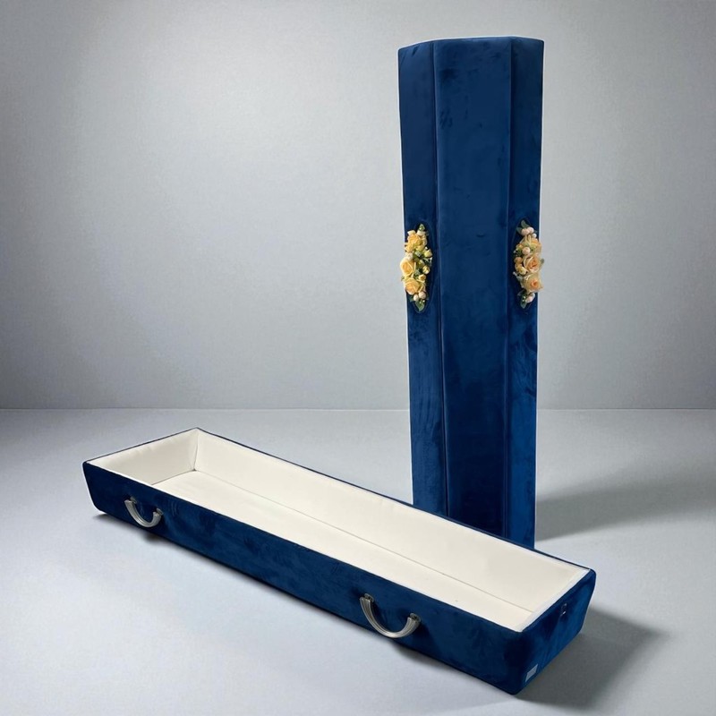 Синий бархат, используемый в обивке, символизирует спокойствие, вечность и надежду. Его глубокий оттенок придает гробу ощущение величия и торжественности, создавая атмосферу благоговения и почтения. Мягкая, бархатистая текстура ткани приятна на ощупь и визуально смягчает трагичность момента.